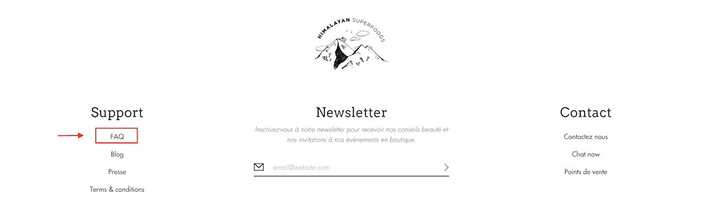 Cependant, la solution la plus répandue consiste à indiquer la page FAQ sur le bas-de-page de votre site. Elle est ainsi toujours visible et accessible, quelle que soit la page visitée par le client.