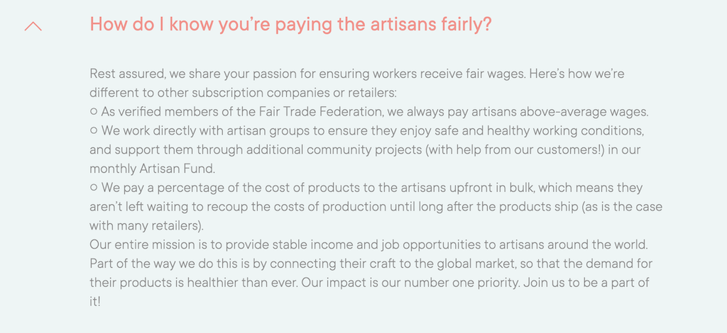 GlobeIn utilise sa page FAQ pour répondre sans ambiguïté à cette question, en expliquant les détails de son fonctionnement et en précisant qu’elle est un membre contrôlé de la Fair Trade Federation. Ces informations rassurent les clients, qui sont ainsi heureux de faire leurs achats chez elle.