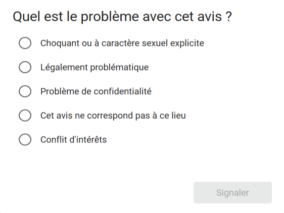 Avant d’entamer une procédure de signalement pour les avis que vous considérez suspicieux, gardez à l’esprit que Google supprime (en théorie) automatiquement les avis qu’ils considèrent inappropriés.