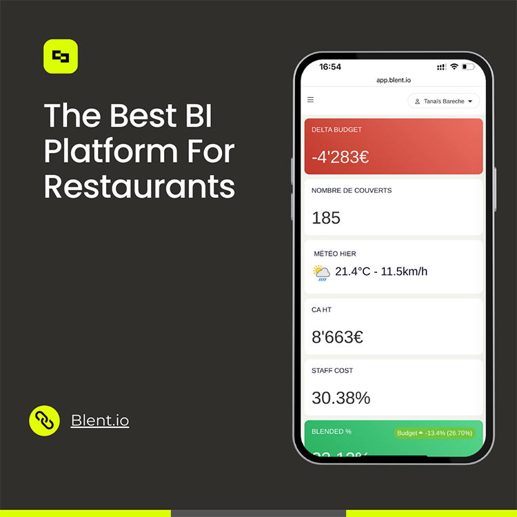 Blent est une plateforme de Business Intelligence créée par des experts du monde de l’Hospitalité. Elle offre une approche à 360 degrés de votre entreprise qui répond aux besoins réels des acteurs de la Restauration. Blent centralise l’ensemble des données générées, vous permettant de suivre vos KPI essentiels, d’analyser les tendances du marché et de prendre des décisions éclairées pour propulser votre établissement ou groupe vers de nouveaux sommets.
