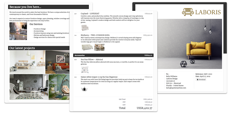 - Avec QuoteMachine, créer des soumissions et des factures est très facile. Avec des modèles personnalisables de documents qui mettent en avant votre marque et vos couleurs, des descriptions de produits enrichies, des soumissions et factures en ligne qui vous disent quand vos clients les consultent et leur permettent d’interagir, vous serez en mesure d’offrir une expérience de vente qui vous distingue.