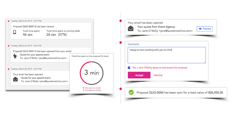 - Vos clients peuvent accepter vos offres en ligne. Si vous devez les mettre à jour ou les renvoyer, QuoteMachine vous facilite la vie en organisant les versions et en vous aidant à automatiser leur création et le paiement.